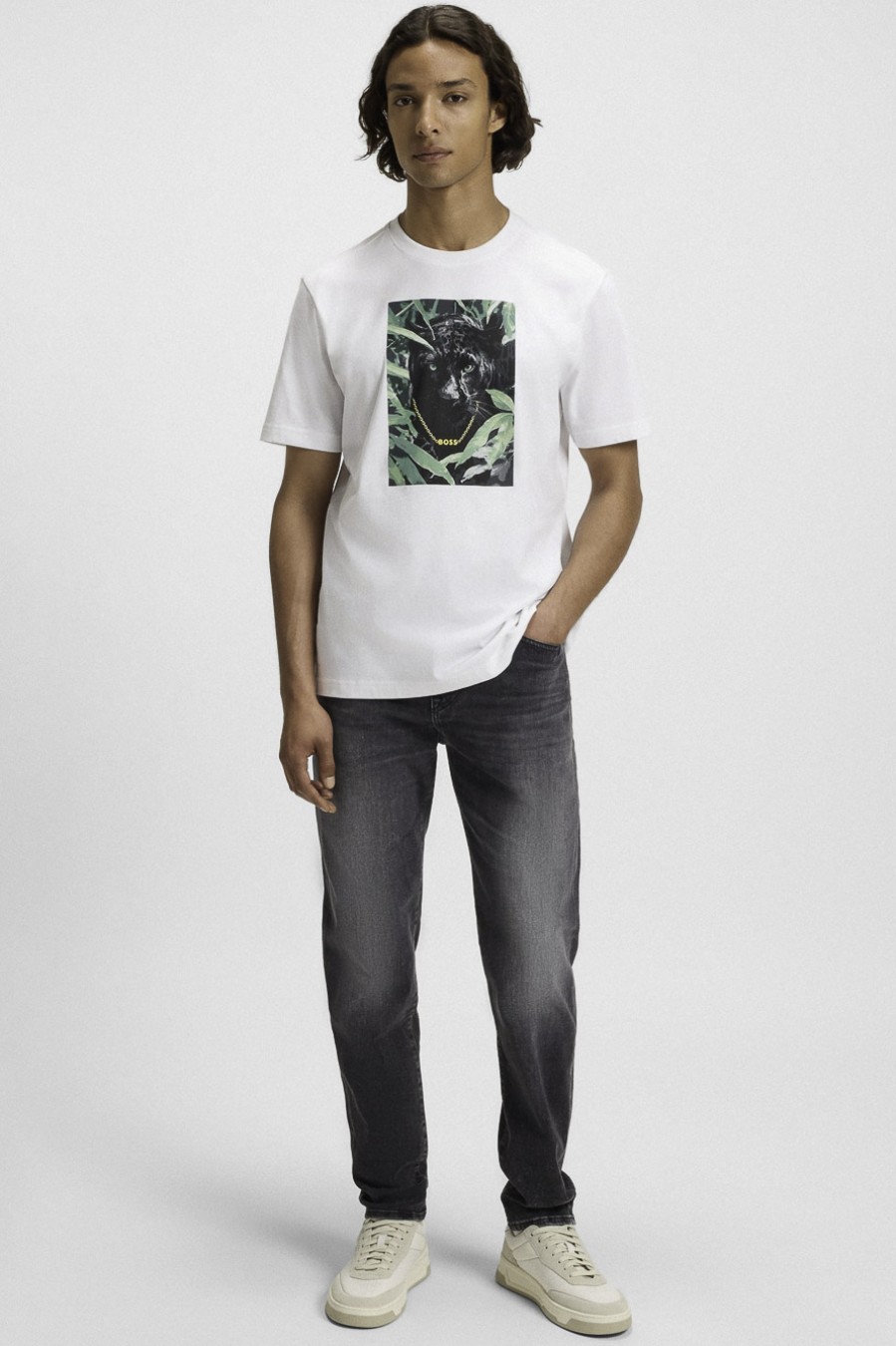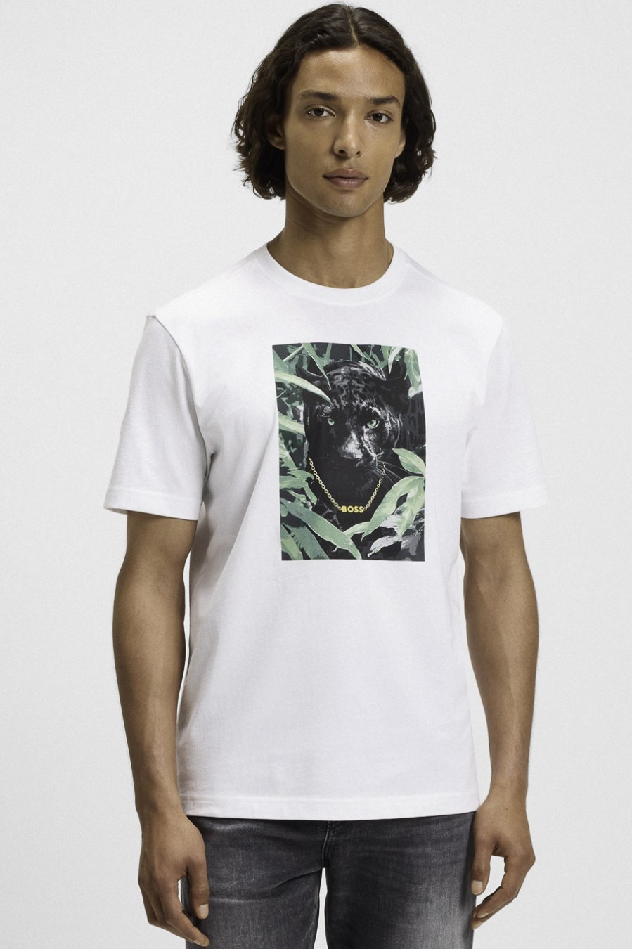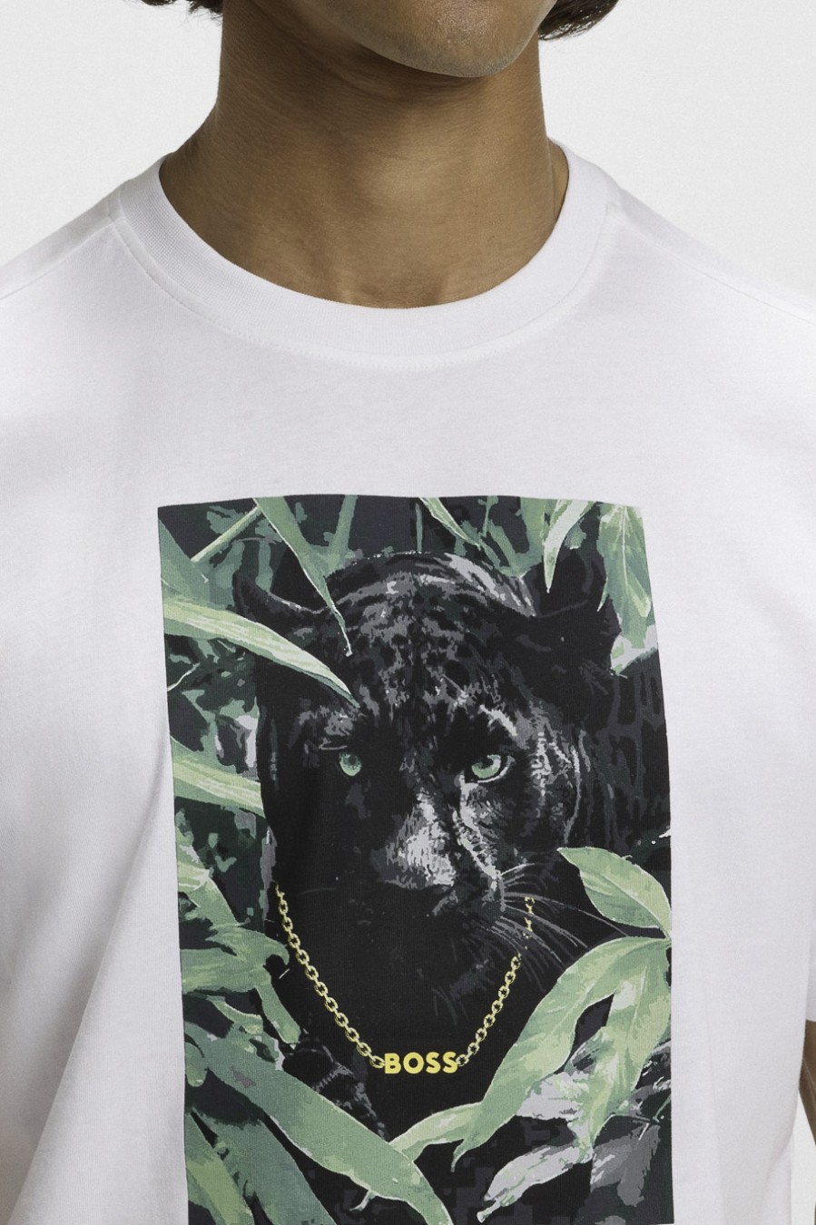 145175 Με ίσια γραμμή, αυτό το T-shirt BOSS Menswear με στρογγυλή λαιμόκοψη τραβάει την προσοχή με το τυπωμένο σχέδιο με ζώα. Απαλό βαμβακερό ζέρσεϊ. Κανονική εφαρμογή. Σύνθεση: 100% Βαμβάκι