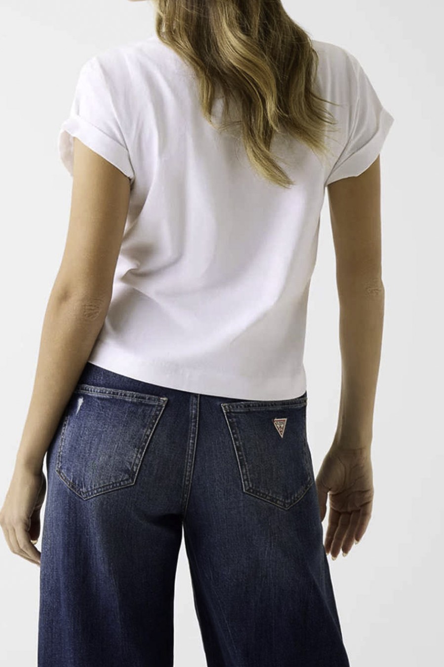 502805 Γυναικείο t-shirt, σε κανονική γραμμή, κοντομάνικο, με στρογγυλή λαιμόκοψη και λογότυπο με strass λεπτομέρειες μπροστά. Σύνθεση: 100%ΒΑΜΒΑΚΙ