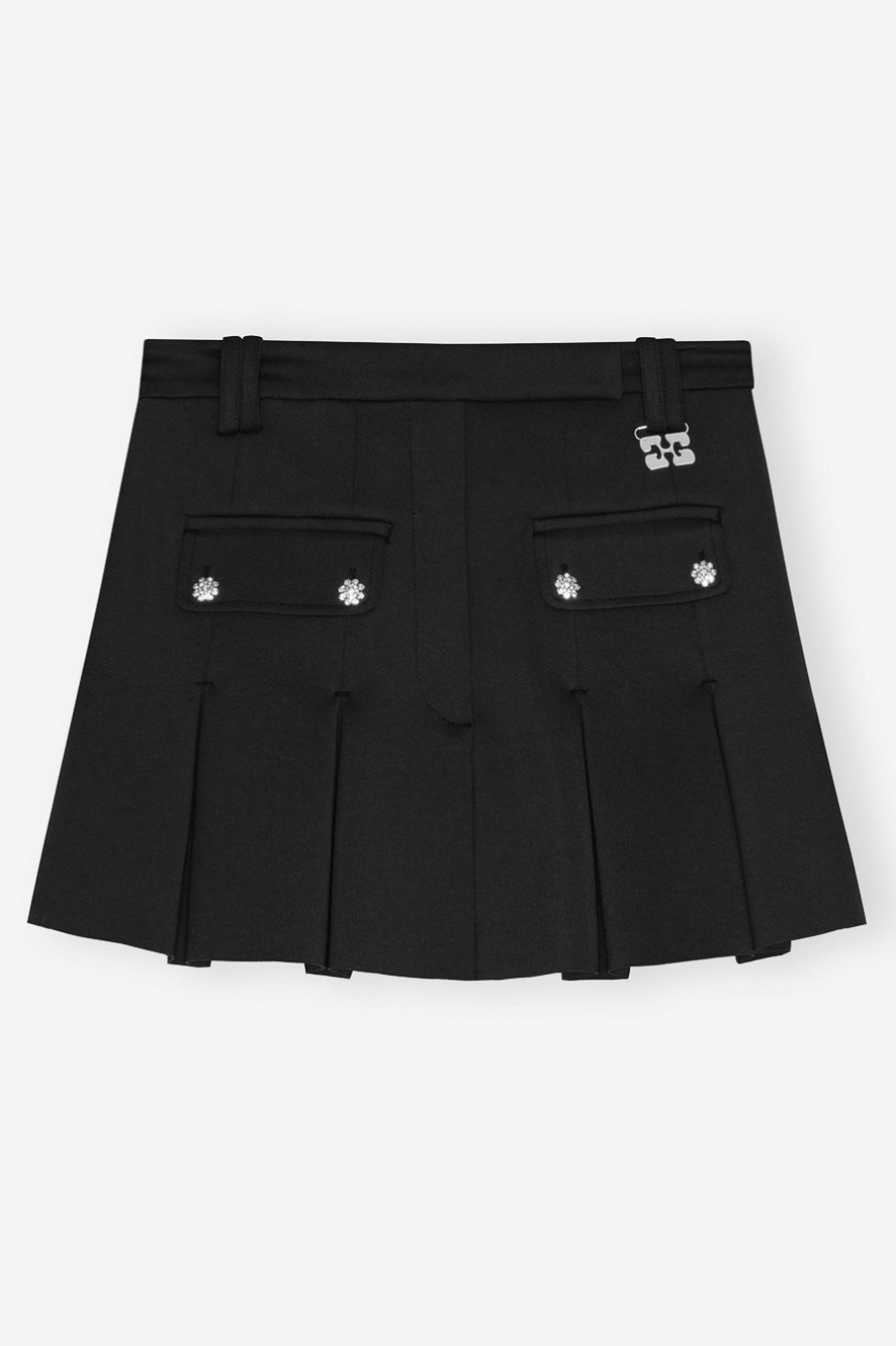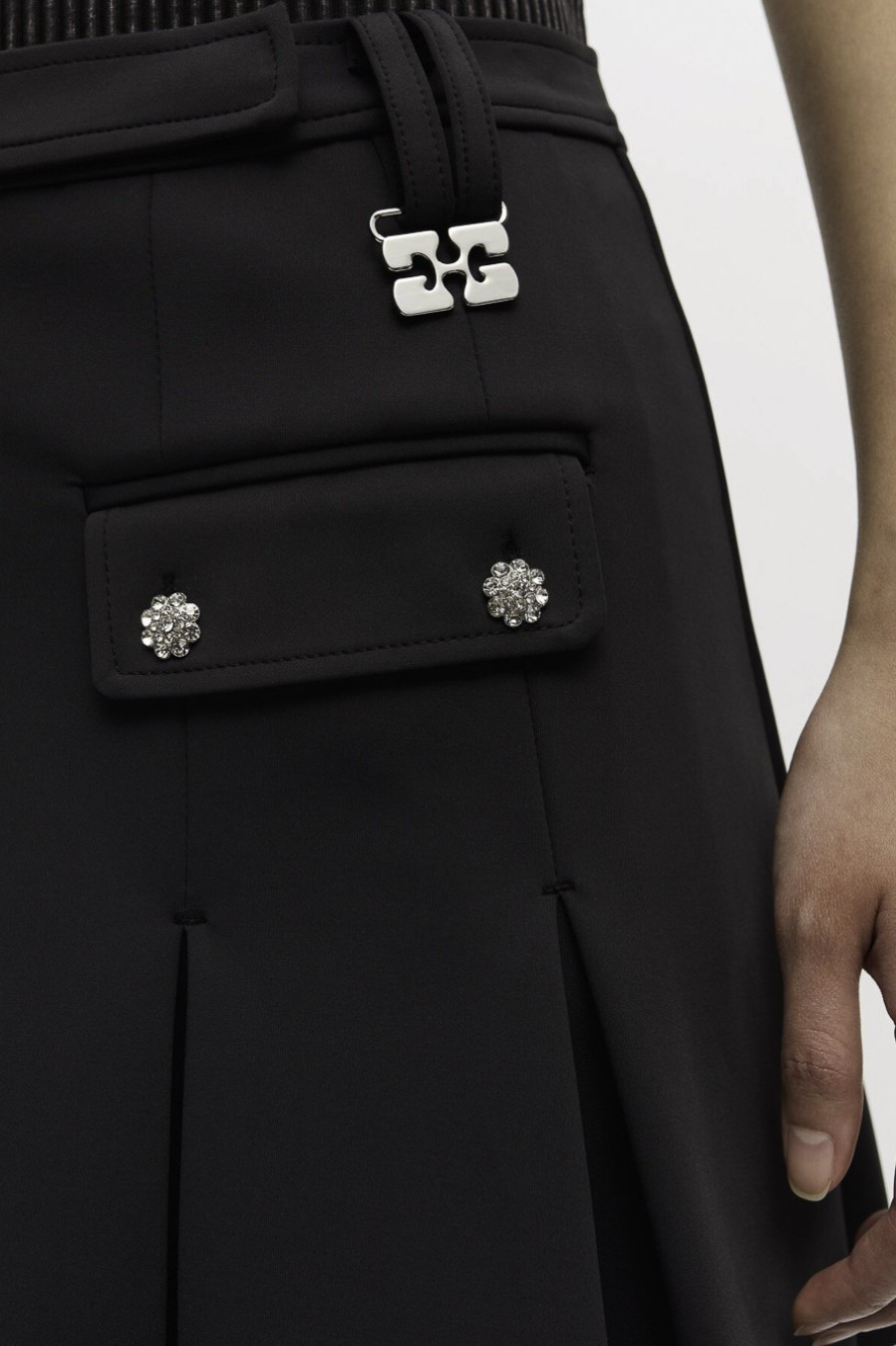 502326 Αυτή η φούστα διαθέτει κούμπωμα με φερμουάρ, 2 μπροστινές τσέπες με ασημένια κουμπιά με στρας, πτυχωτό στρίφωμα και ασημί λεπτομέρεια με το λογότυπο GANNI Butterfly. 80% ανακυκλωμένο πολυαμίδιο, 20% ελαστάνη
